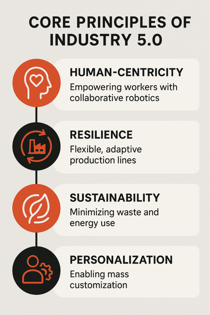 Tööstus 5.0 tugineb kolmele põhimõttele. Esiteks inimkesksus: tehnoloogia peab toetama inimese tööd, mitte sundima inimest kohanema tehnoloogiaga. Teiseks jätkusuutlikkus: tootmine ei tohi olla ainult efektiivne, vaid peab arvestama ressursikasutuse ja keskkonnamõjuga. Kolmandaks vastupidavus: süsteem peab toimima ka siis, kui kõik ei lähe plaanipäraselt.
