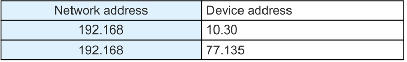 Seadmete vastavad aadressiosad on seadmetele määratud. Ülemises alamvõrgus 1 koosneb vasakpoolse arvuti IP-aadress võrgust 192.168 ja seadme osast 10.30, tulemuseks IP-aadress 192.168.10.30. Parempoolse arvuti puhul on see võrgust 192.168 ja seadme osast 77.135, andes tulemuseks IP-aadressi 192.168.77.135.