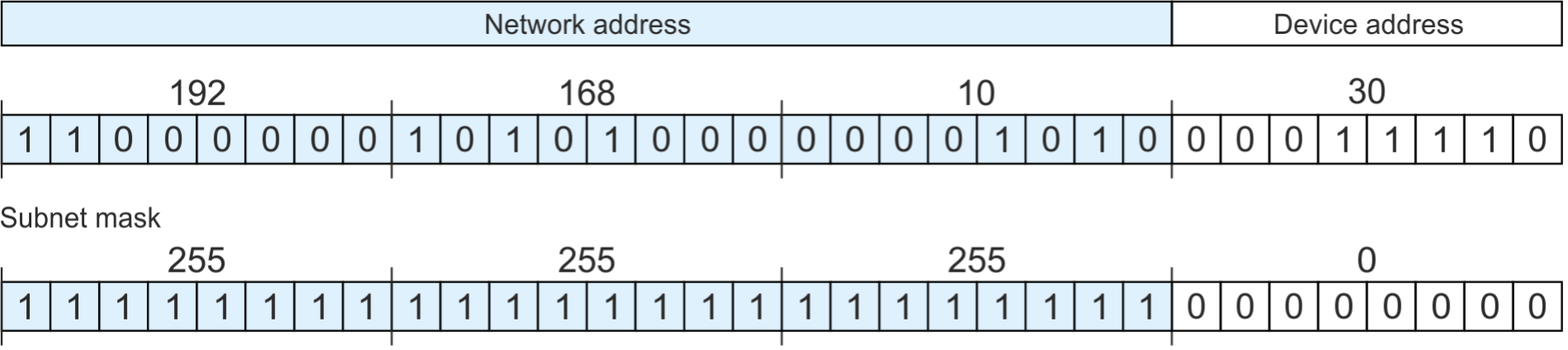 | /24 | 11111111 11111111 11111111 00000000 | 255.255.255.0 |