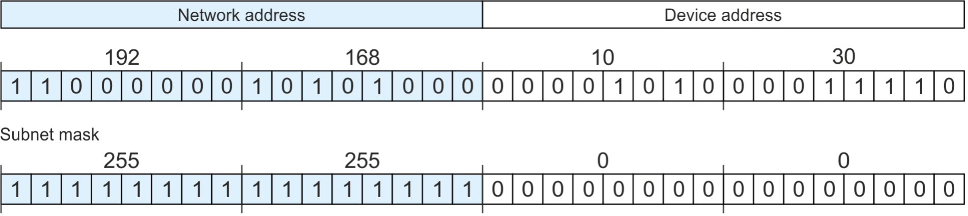 Kaks seadet aadressidega 192.168.10.20 ja 192.168.77.135, mis esimesel juhul asusid kahes erinevas võrgus, kus võrguaadressiks oli kolm baiti, on nüüd ühes võrgus. Samal ajal tähendab aadressi laiem seadmeosa, et palju rohkem terminalseadmeid saab olla adresseeritud selles “192.168” võrgus. Teisel juhul saab alamvõrgus olevaid terminale nummerdada vahemikus 0.1 kuni 255.254. See tähendab, et võrgus on adresseeritavad 256 * 256 – 2 = 65 534 seadet. Siinjuures ei ole lubatud kasutada vahemiku esimest aadressi (192.168.0.0) ega viimast aadressi (192.168.255.255) terminalseadmete aadressidena.
