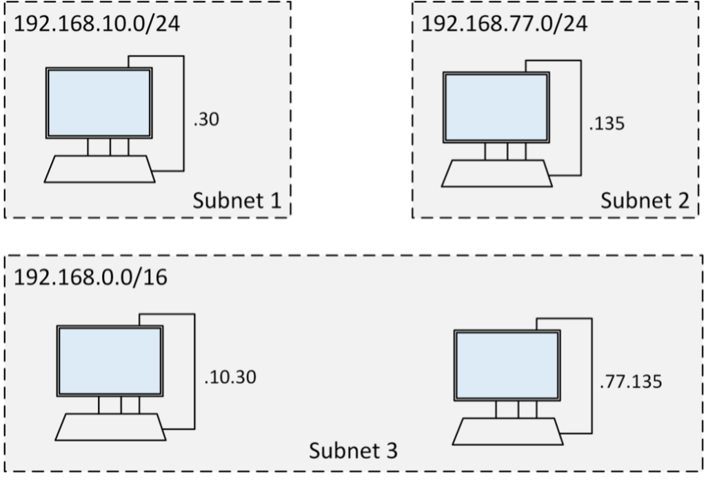 Seega on võrgu aadressid näidetes 192.168.10.0/24 ja 192.168.77.0/24 ning 192.168.0.0/16. Kuna nulli kasutatakse võrgu tähistamiseks, ei saa seda terminalaadressina kasutada.