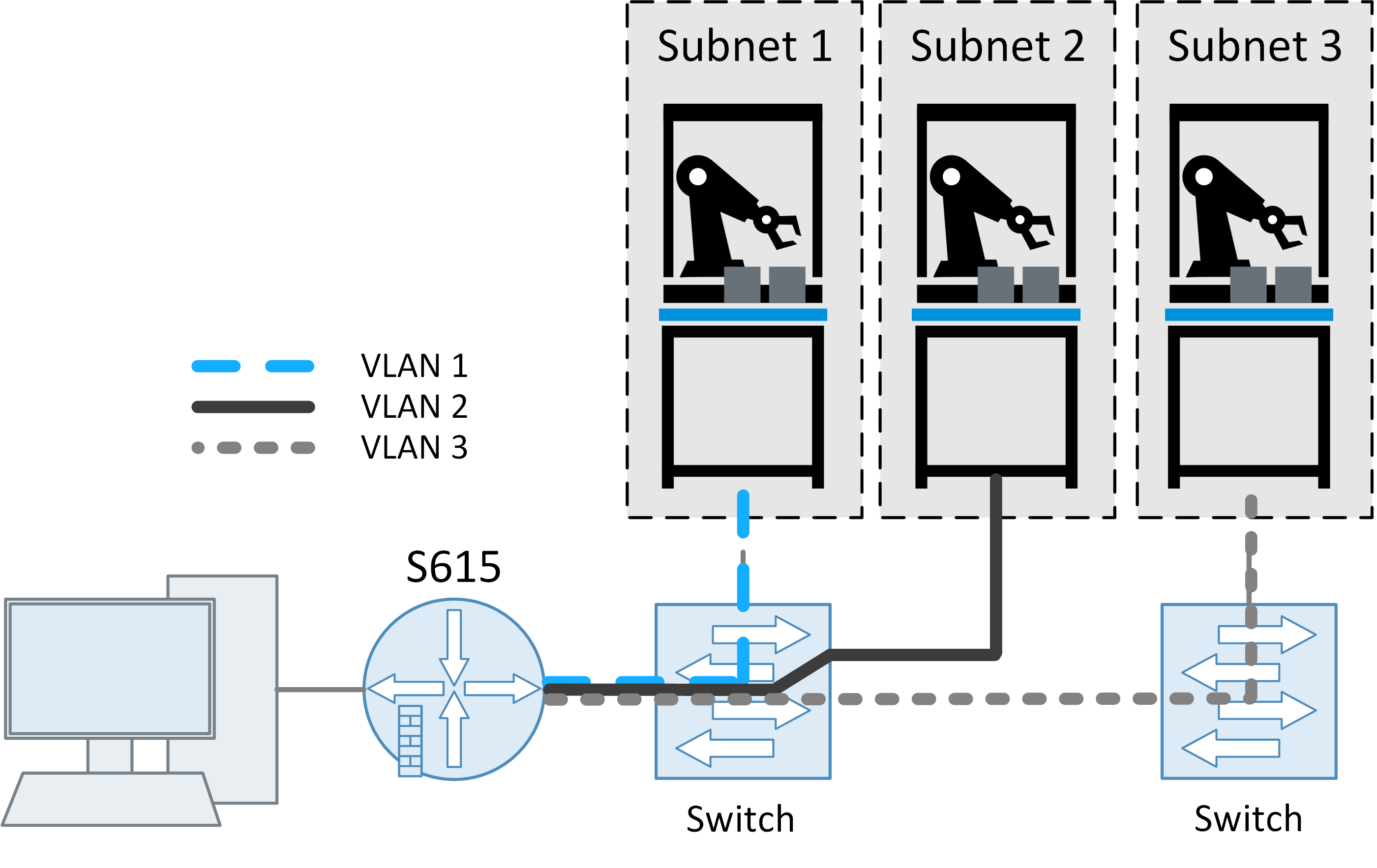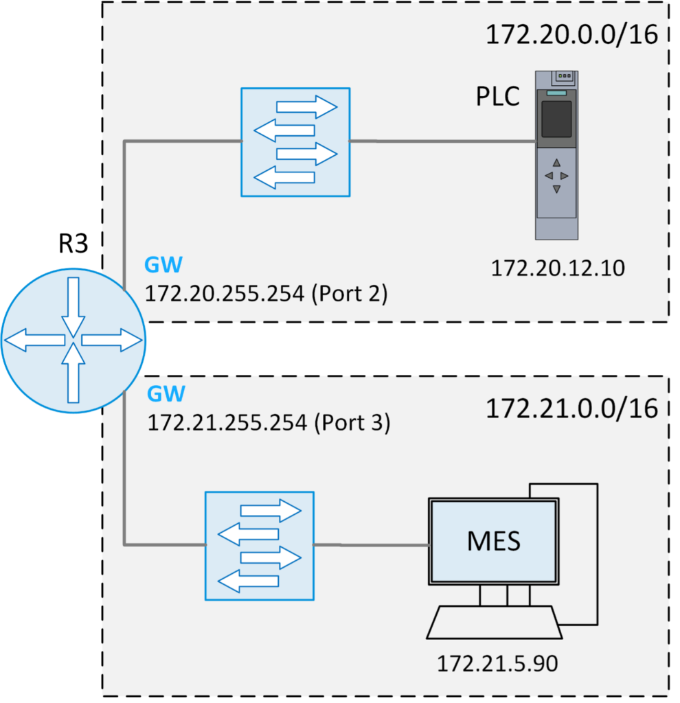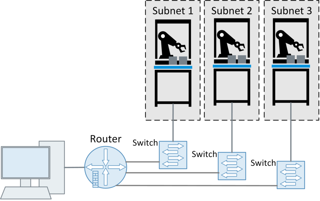 Et vältida liiga suuri levialasid ja ebasoovitavaid juurdepääse võrgus, on soovitatav jagada võrgud väiksemateks aladeks. Näiteks tootmisüksus, millel on kolm alamosa, mis on algselt ühendatud üheks ühtseks võrguks:.
