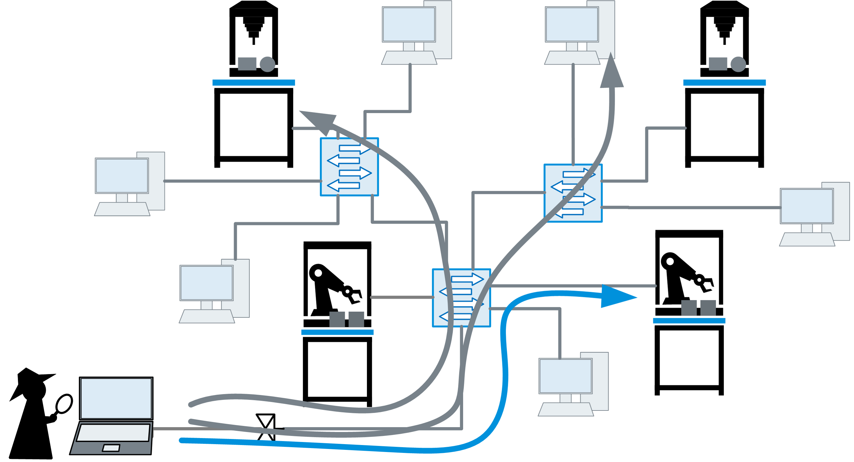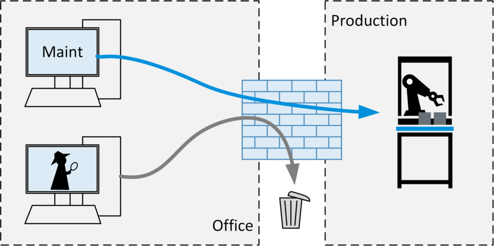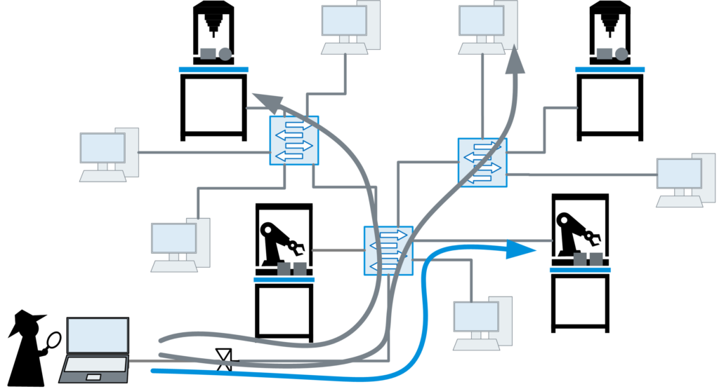 Järgmine joonis illustreerib olukorda, kus hooldustehnik pääseb ligi robotite koosteliinile (sinine nool) ja samal ajal kasutab seda juurdepääsu, et pääseda ligi konkurendi puurseadmele ja teisele arvutile võrgus (hallid nooled).