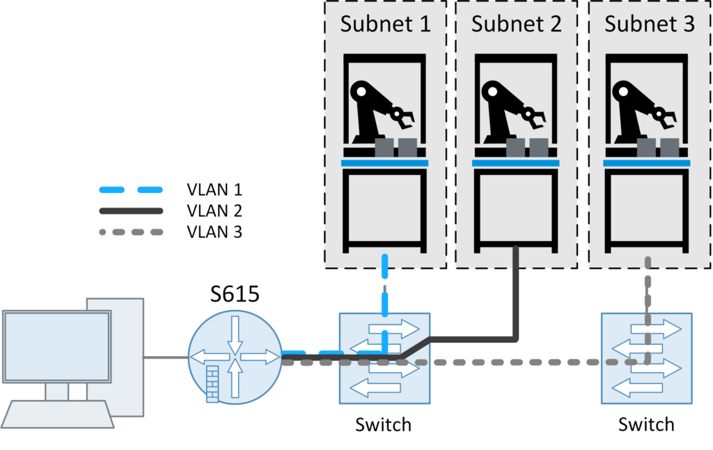 See lahendus eraldab võrgud väga tõhusalt, kuid sellel on tõsine puudus: võrguosade arv peab suurenema ja vaja on täiendavaid ühenduskaableid (alates kesk- ja parempoolsest jaoturist ruuterini). Eriti olemasolevate installatsioonide puhul võib uute ühenduskaablite vedamine olla väga kulukas. Odavam lahendus on seadistada erinevad võrgud ainult virtuaalselt. Sel juhul ühendatakse jaamad VLAN-võimelise lülitiga, mis märgib jaamade sisenevad andmepaketid ja teeb need eristatavaks. See märgistus kantakse edasi järgmisele ruuterile, kus tehakse otsus, kas ja millist suhtlust alamsidevõrkude ja välismaailma vahel tuleks lubada.