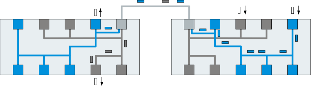 Eelmises osas kirjeldati, et värvikoodid eemaldatakse väljundis. Seda mehhanismi saab teadlikult üle kirjutada, et transportida virtuaalset kohalikku võrku mitme lüliti kaudu. Järgmine pilt näitab olukorda, kus mõlemal lülitil on üks port, mis kuulub nii sinise kui ka halli VLAN-i alla. Nendest portidest väljuvad andmepaketid säilitavad oma värvimärgistuse, nii et need on juba järgmises lülitis sisenevate pakettidena olemas.