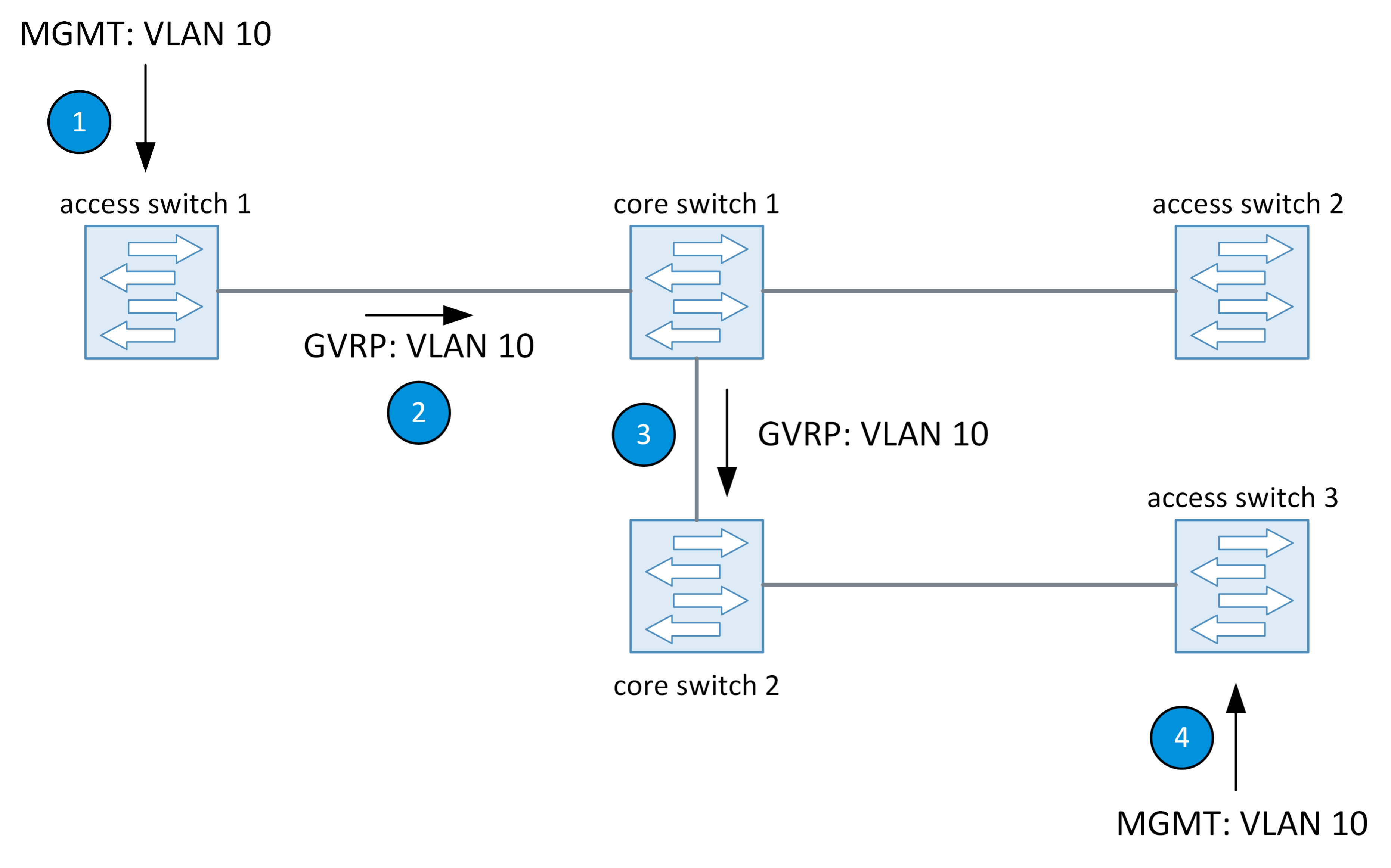 Näites luuakse uus VLAN ID-ga 10 juurdepääsulülitisse, mis vastutab terminalide eest (Access Switch 1). See uus VLAN edastatakse automaatselt võrgu tuumikus asuvale esimesele lülitile (Core Switch 1) GVRP-protokolli kaudu. Seejärel edastab esimene lüliti uue VLAN-i teisele tuumiku lülitile (Core Switch 2) kolmandas etapis. Nüüd on sisemine võrk valmis VLAN 10 kaudu suhtlust haldama.