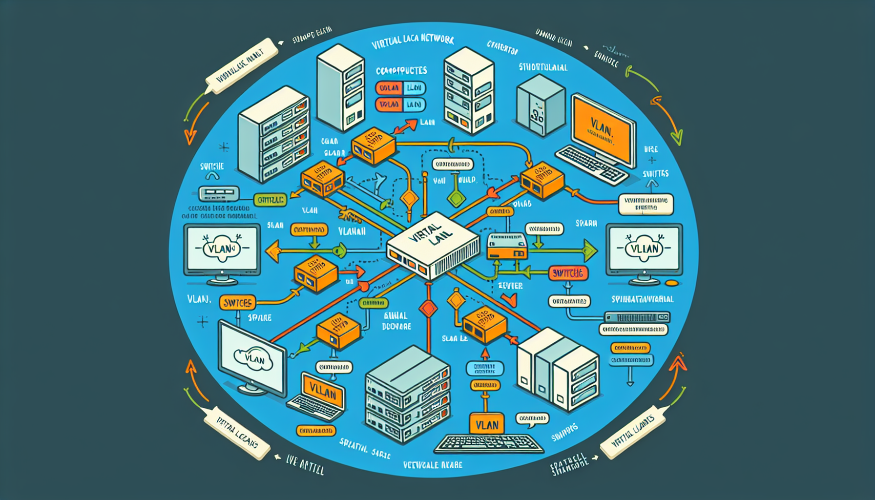 Võrgu pakettide värvikoodistamise kujutamine aitab mõista virtuaalsete kohalike võrkude põhimõtet. Lüliti pordid määratakse VLAN-ile kindla värviga. Järgmine pilt näitab lülitit, mille kümme porti on jagatud kahte erinevasse rühma (sinine ja hall).