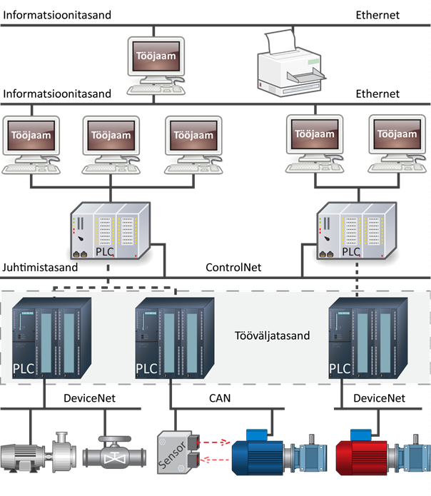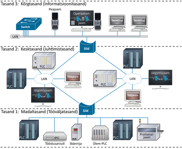 - Tööväljatasand: sidevõrgud koos programmeeritavate loogikakontrollerite, andurite ja täituritega.