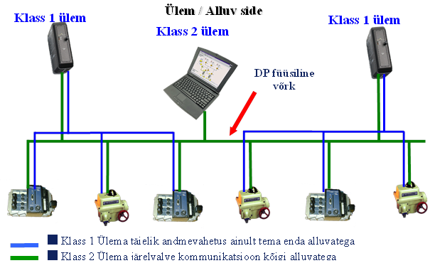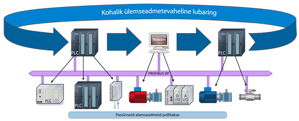 Profibus süsteem kasutab Profibus ülemseadet, mis teostab mööda RS 485 magistraalliini (pilt 5.5) hajutatud alluvseadmete pollimist (pilt 5.4).