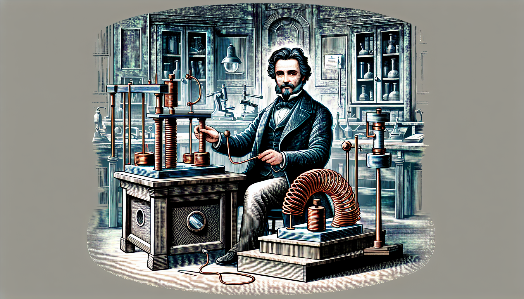 Pildil on kujutatud Faraday kuulsat eksperimenti, kus ta avastas, et muutuv magnetväli võib tekitada elektrivoolu.