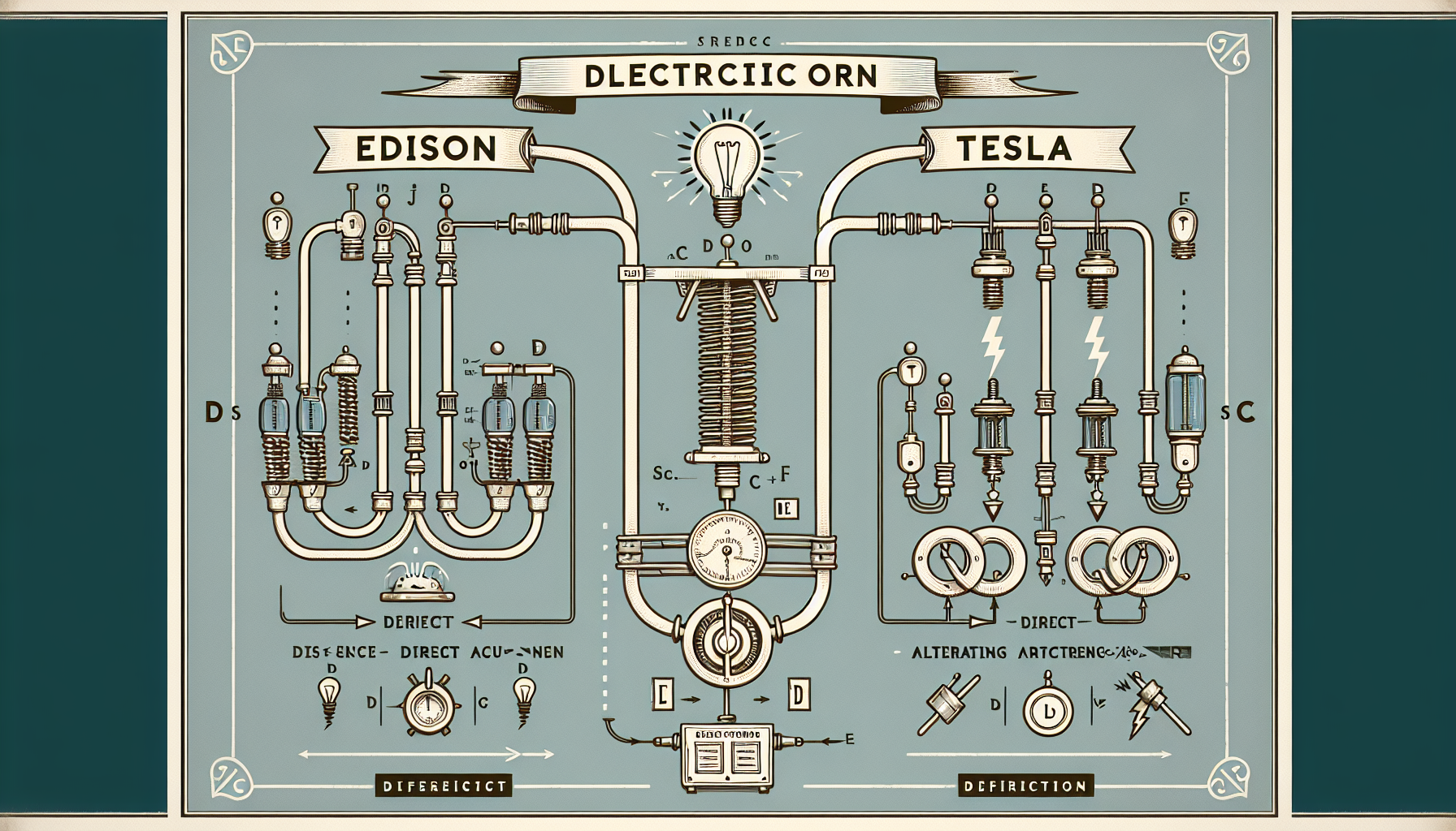 19. sajandi lõpp tõi kaasa elektrienergia tootmise ja jaotamise tehnoloogiate arengu. Thomas Edison ja Nikola Tesla olid selle perioodi juhtivad figuurid. Edison pooldas alalisvoolu (DC) süsteemi, mis oli sobiv lühikeste vahemaade jaoks, samas kui Tesla tutvustas vahelduvvoolu (AC) süsteemi, mis osutus tõhusamaks elektri edastamisel pikkade vahemaade taha. AC-süsteem on siiani kasutusel kogu maailmas.
