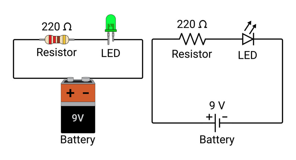 LED-i süütamiseks kasutatakse toiteallikat koos takistiga, et piirata voolu LED-is. LED-i tööpinge on tavaliselt 2 V, mis tähendab, et kui toiteallikas on 5 V, tuleb ülejäänud pinge võtta maha takistiga. Kasutades Ohmi seadust: