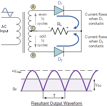 Täisperioodalaldi, mis kasutab neljast dioodist koosnevat dioodsilda, laseb läbi mõlemad poolperioodid, pakkudes sujuvamat ja kõrgema keskmise pingega väljundit: