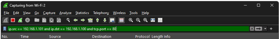 ip.src == 192.168.1.101 and ip.dst == 192.168.1.100 and tcp.port == 80konkreetse voo filtreerimiseks.