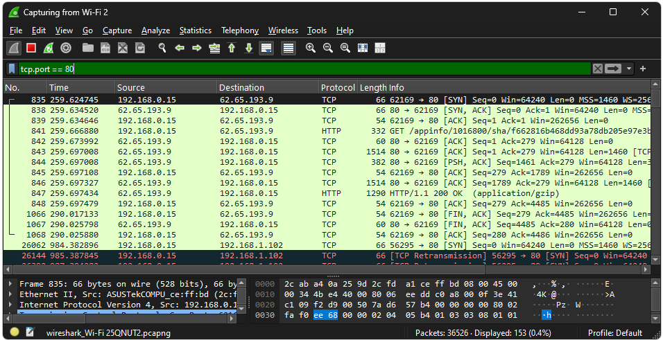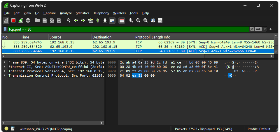 tcp.port == 80kogu liikluse filtreerimiseks, mis on seotud portiga 80.