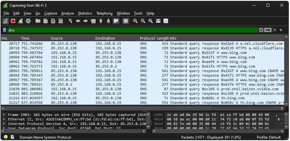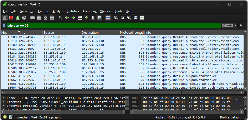 - DNS päringud ja vastused: Wireshark saab kasutada DNS päringuid ja vastuseid hostinimede tõlkimiseks IP-aadressideks, võimaldades filtreerida liiklust hostinimede alusel.