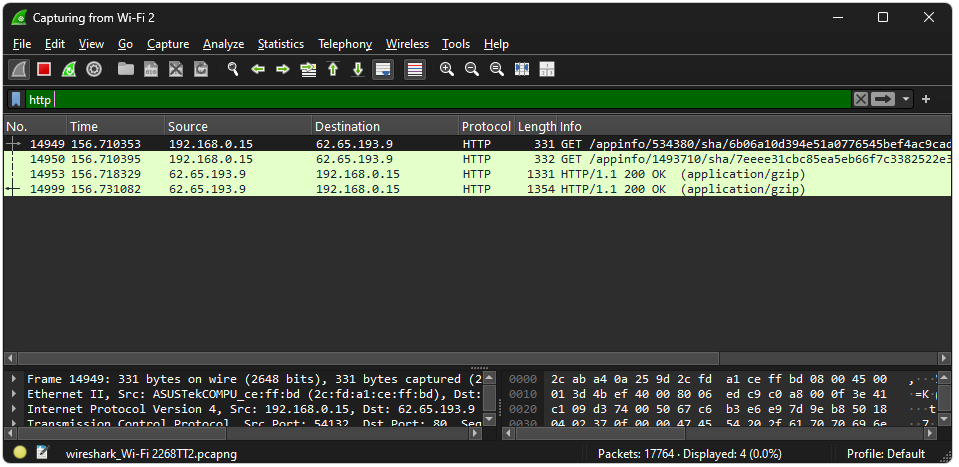 - Wireshark hakkab nüüd püüdma kõiki pakette, mis liiguvad läbi valitud adapteri.