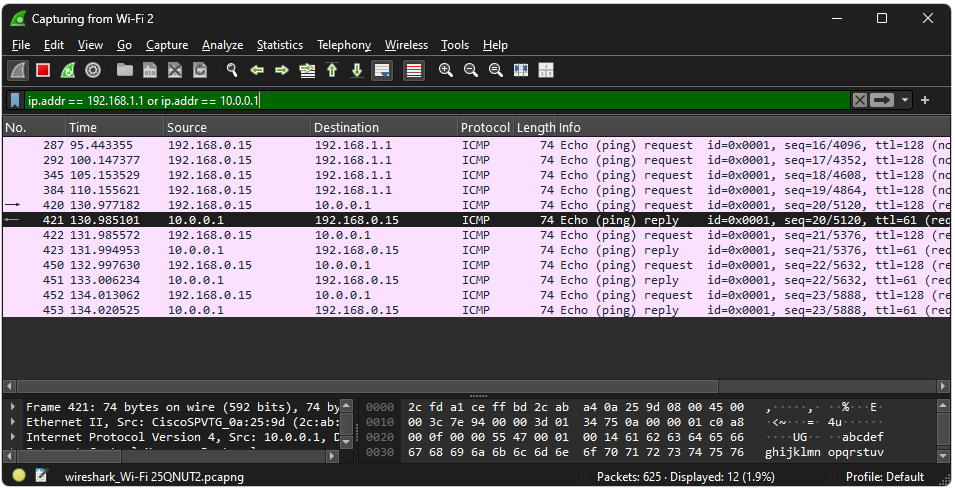 - Näide: Kui soovite jälgida kõiki pakette, mis liiguvad lähteaadressilt 10.0.0.1 sihtaadressile 10.0.0.2, kasutage filtrit