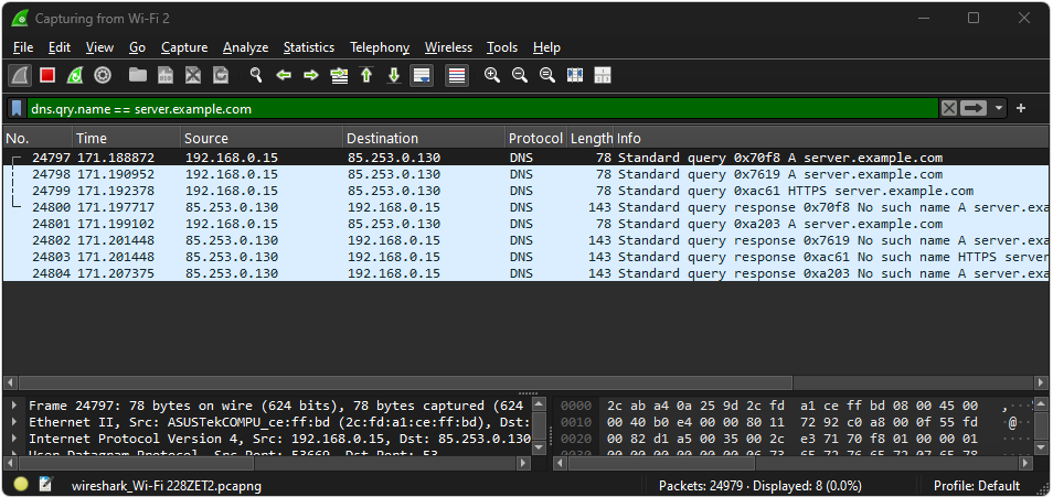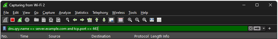 dns.qry.name == server.example.com(filtreerib kõik paketid, mis on seotud hostinimega “server.example.com”)