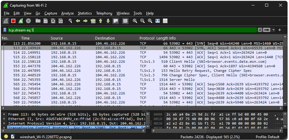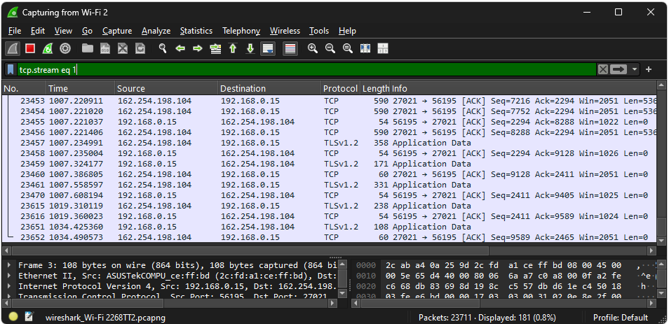 - Voonumbrite kasutamine: Wireshark määrab igale TCP voole unikaalse voonumbri, mida saab kasutada konkreetse voo filtreerimiseks ja analüüsimiseks.