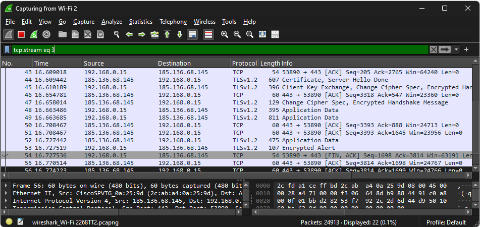 Wireshark võimaldab mitte ainult IP-aadressi, pordi ja protokolli alusel filtreerida liiklust, vaid ka konkreetsete andmevoogude alusel. Voo filtreerimine on kasulik, et jälgida ja analüüsida konkreetseid andmevooge, mis liiguvad seadmete vahel, võimaldades detailset liikluse analüüsi ja tõrkeotsingut.