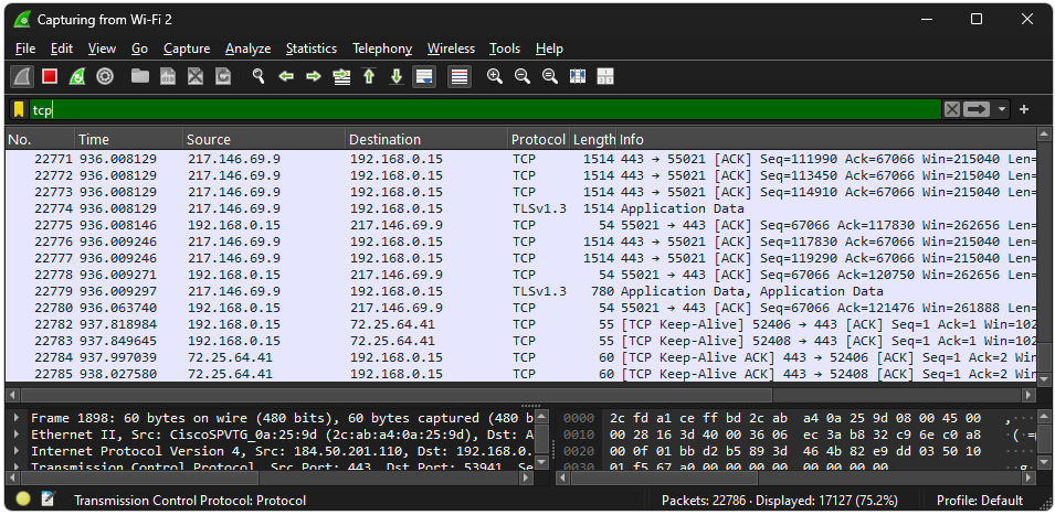 - TCP ja UDP filtreerimine: Wiresharkis saab määrata filtreid, mis põhinevad TCP või UDP protokollidel. See võimaldab jälgida, kuidas andmeedastus toimub võrgu erinevate osade vahel.