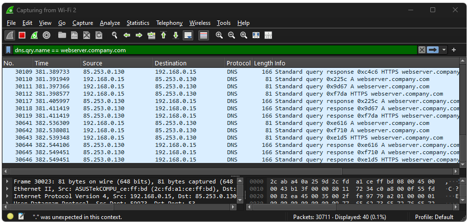 dns.qry.name == webserver.company.comkogu liikluse filtreerimiseks, mis on seotud hostinimega “webserver.company.com”.