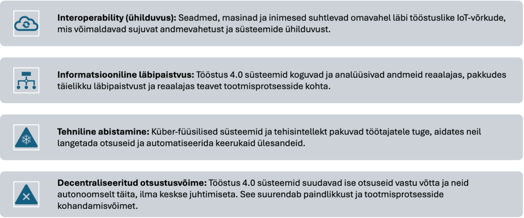 - Decentraliseeritud otsustusvõime: Tööstus 4.0 süsteemid suudavad ise otsuseid vastu võtta ja neid autonoomselt täita, ilma keskse juhtimiseta. See suurendab paindlikkust ja tootmisprotsesside kohandamisvõimet.